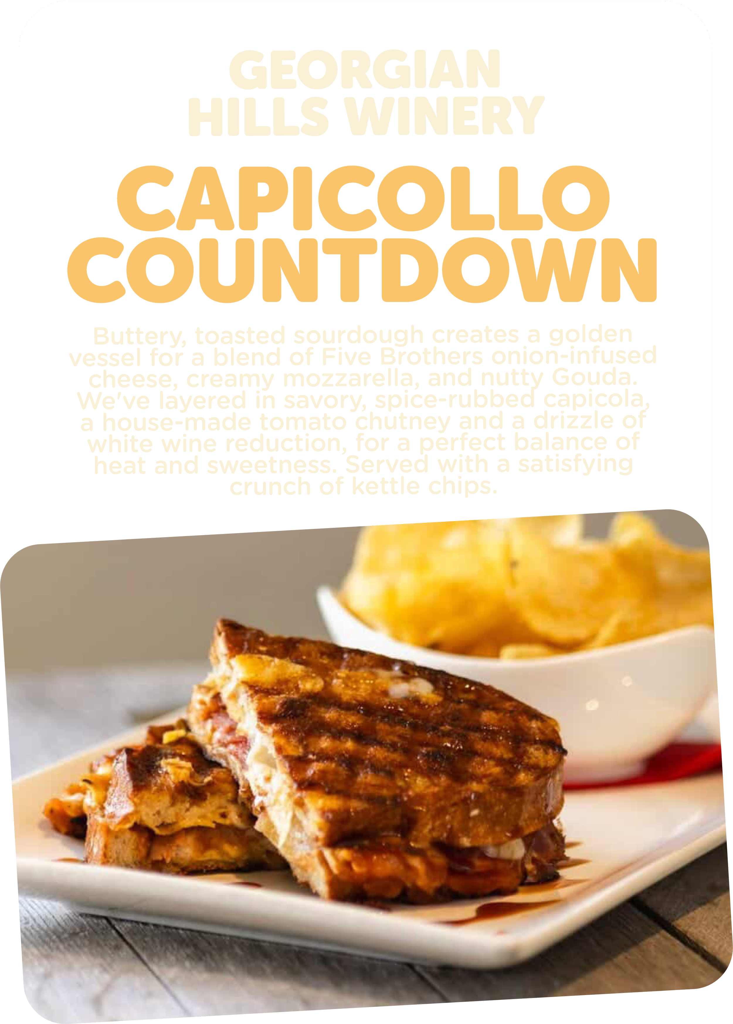 A huge congratulations to Georgian Hills Vineyards for taking home the title of Best Grilled Cheese in the 2024 competition! Their winning creation, “Major Yum Meltdown” , wowed the community with its incredible flavor, creativity, and perfectly melted goodness.